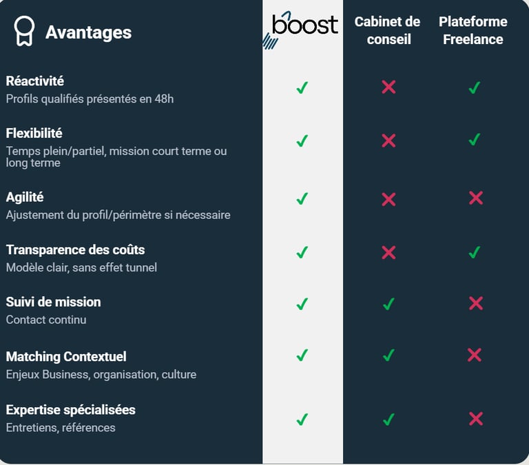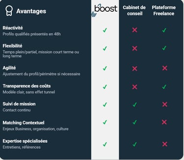 Boost connecte votre direction financière aux consultants indépendants les plus qualifiés pour relever vos défis de transition, de renfort et de transformation, avec agilité et excellence.